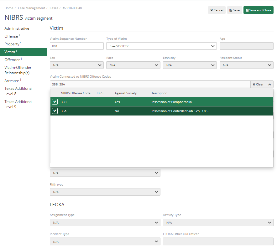 Victim Segment: Here State is Victim, so it pulls Society as Victim. Make sure to tick Offense Code in Victim Connected to NIBRS Offense Codes.