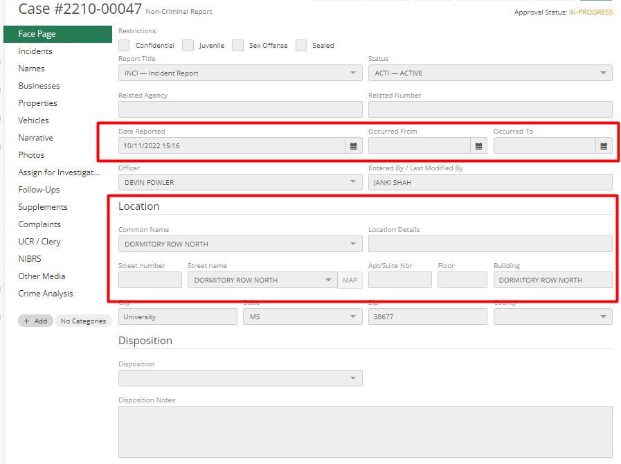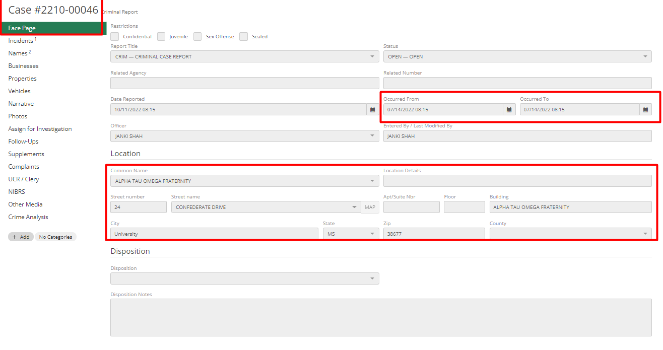 From Face Page Tab, it will import the Date, Time, and Location or NIBRS Address Type of the Crime.