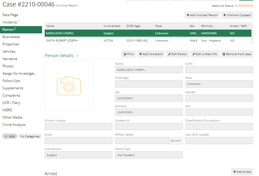 Arrestee: In this example, there is no known Offender so there is no arrest in this case.
