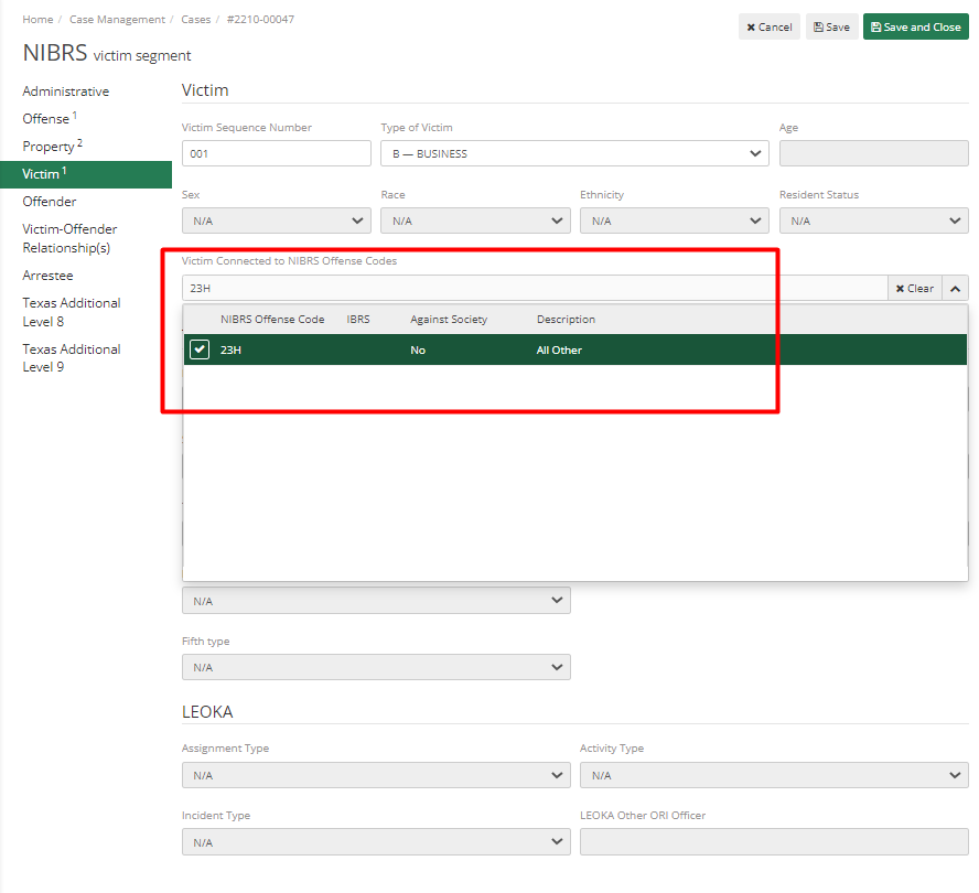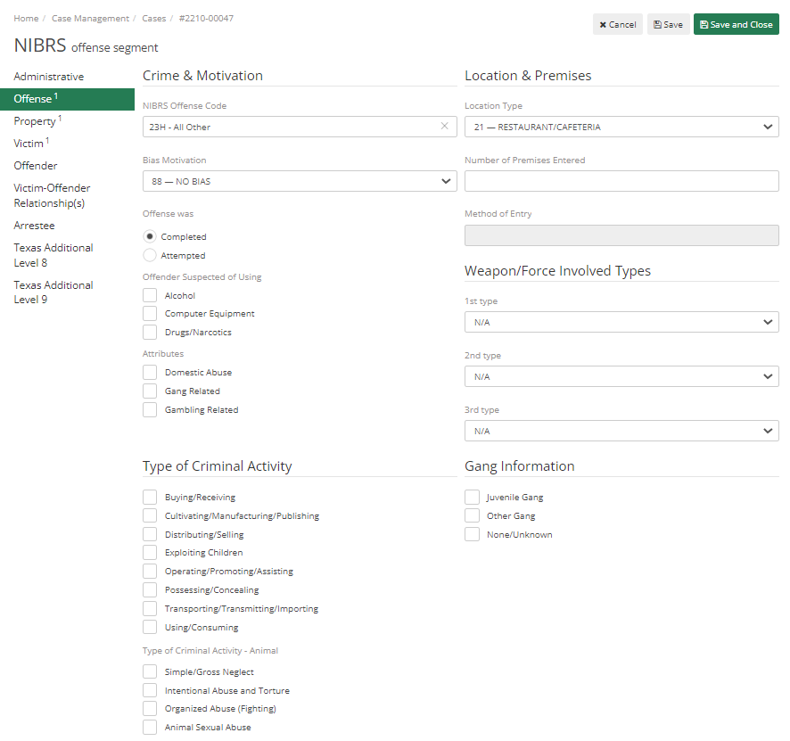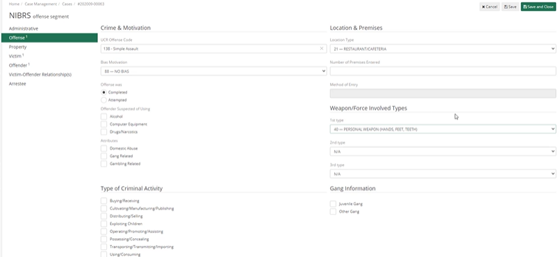Victim–Offender Relationships: This segment will be greyed out, as Victim is Business so there can’t be any relationship between Business and Offender. If the victim was an individual, then Relationship would have been required.