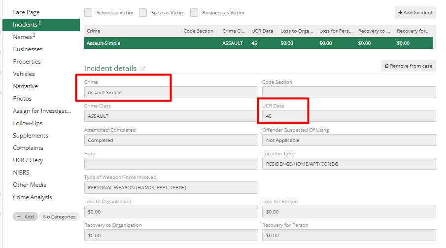 NIBRS Review will pull the Crime Code from the Code List as per the Crime Selected in Incident Tab. Simple Assault is 13B – Crime Against Person.