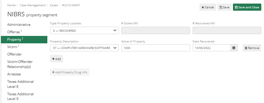Property Segment: Property is involved, so all its details are already imported to NIBRS Review. The Value of Property for drugs has to be blank, as it cannot be specified.