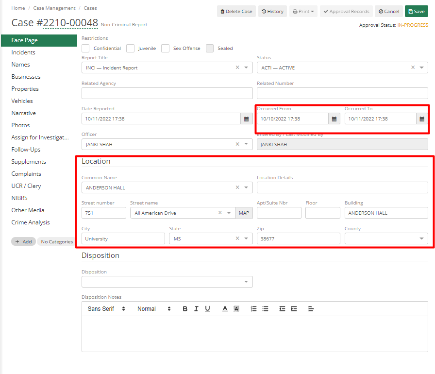From Face Page Tab in Case Management, it will import the Actual Date, Time, and Location of the Case.