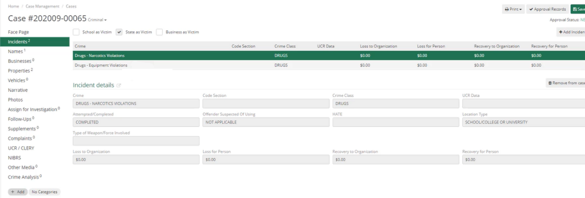 In Incident Tab – Incidents that are added in the case for this example are Drug Narcotics Violations and Drug Equipment Violations. Those incidents with their details will get imported into NIBRS Review.