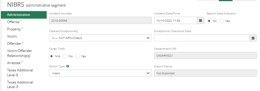 Administrative Segment: No changes will be required in this segment except to select Cargo theft. If it is not selected before saving it will show an error.