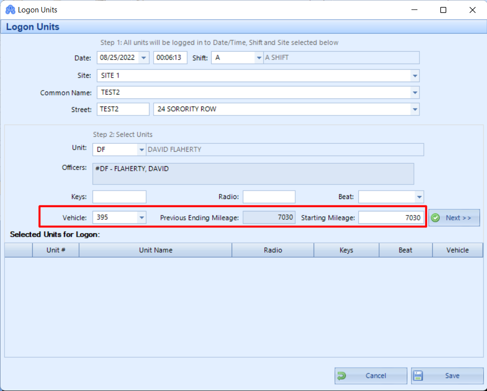 In Logon units, you must log on an officer and then attach a vehicle to them by selecting vehicle dropdown. This dropdown will show a list of the vehicles which are not currently logged on or are not assigned to any officer. Once you select the vehicle, the previous ending mileage will be automatically fetched by the system. You can keep the starting mileage as it is, or you can add a different one if someone was driving it after hours, who are not on actual patrol, or something similar. Once you’ve added all details hit Save.