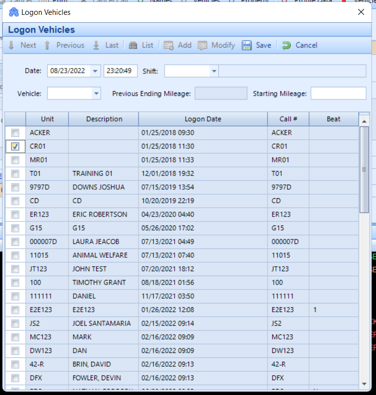 Log On Units – It is used to Log on officers and you can attach a vehicle now, or later attach a vehicle to that officer who is using it.