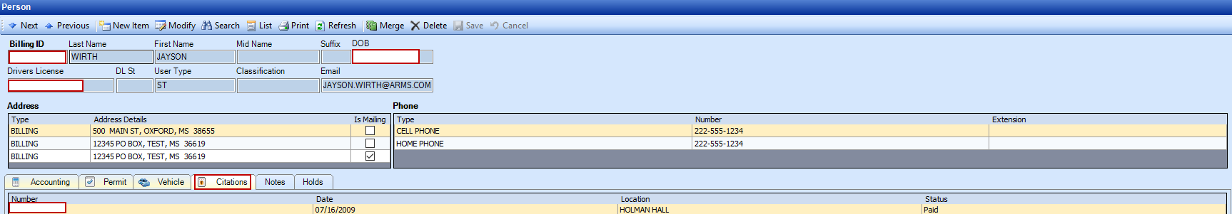 Click "Accept" after the information has been inputted. After the new citation has gone through check to make sure that there is a citation and accounting in each tab in "Persons". Following the completion of these steps the user creating an appeal will be able to do so as normal. If the error still persists, contact ARMS support.