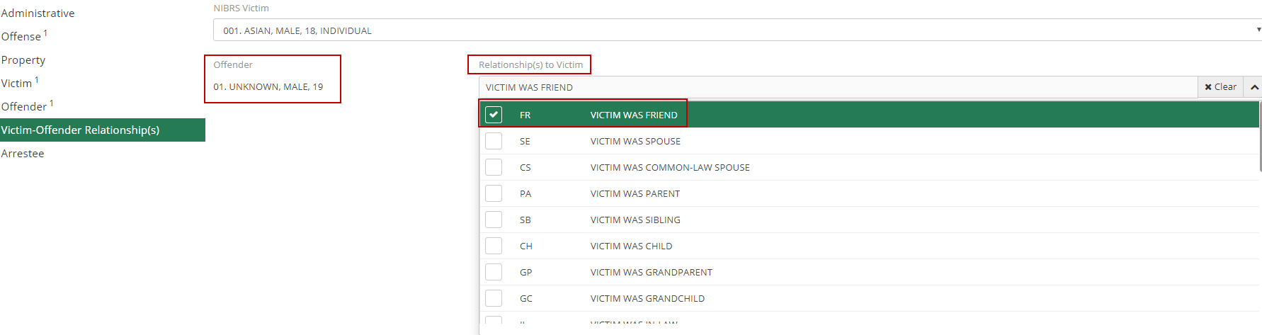 In this tab the user will want to select what type of relationship the victim has to the offender. For example, if the victim was a friend of the offender. The user will want to select "Victim Was Friend". If there are multiple victims, repeat the process. Then click save.