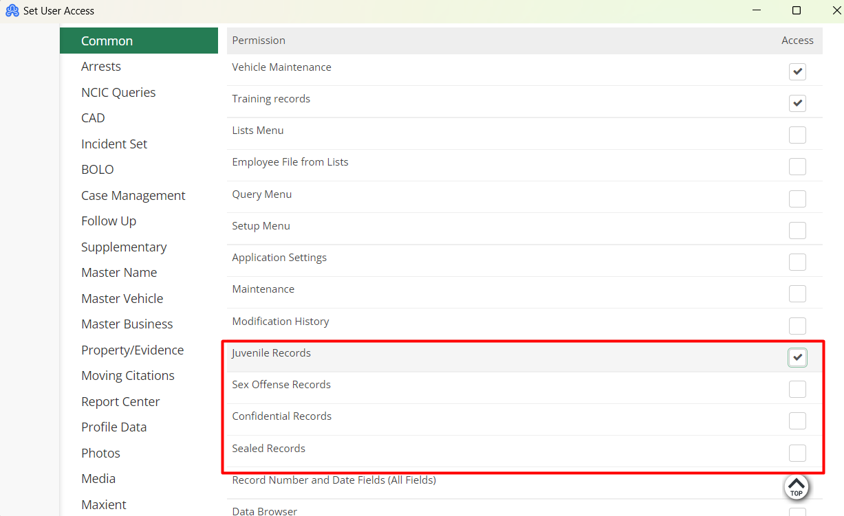 For a user to mark a case with restrictions to Confidential, Juvenile, or Sex offense, the user must have access to the specified areas under Set-User Access.