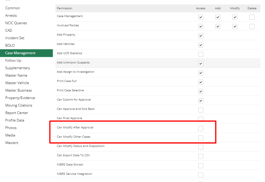 For non-admins, other items that could come into play would be if a case report was owned by another officer and the user did not have "Modify Others Cases" Permission or if the case report had been approved and the user did not have "Modify After Approval" Permission. These can both be accessed and checked from the User Access page of the user in the Setup .