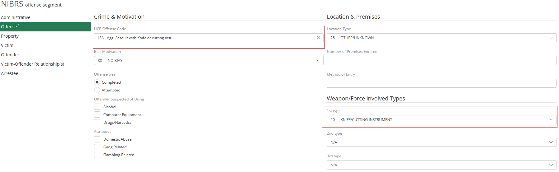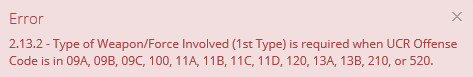 In the Offense Segment the UCR Offense Code box will be utilizing one of the listed codes in the above error message. This error message occurs because there wasn't a weapon listed in the review. The user will need to input what type of weapon or force was used in the case in the "Weapon/Force Involved Types."