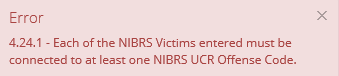 If a user is receiving the below error message of,"Each of the NIBRS Victims entered must be connected to at least one NIBRS UCR Offense Code," while completing a NIBRS Review. Please check the following NIBRS Review segments, and make the changes accordingly.