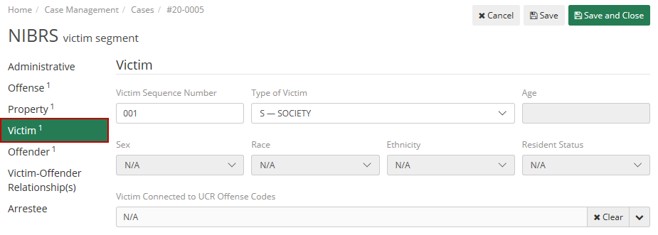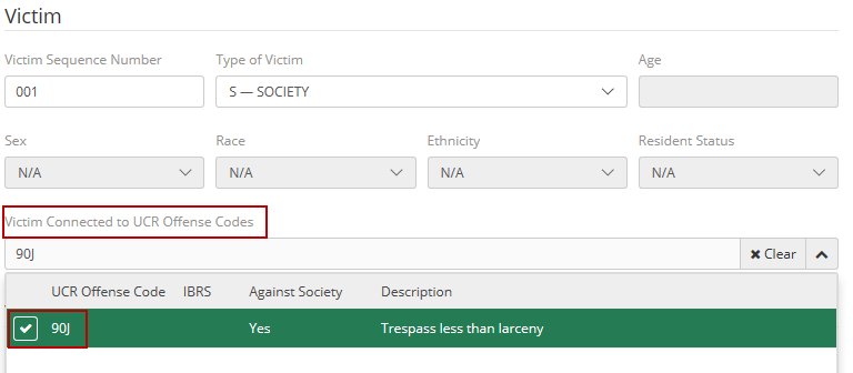 Under the 'Victim Connected to UCR Offense Codes' the user will want to select a connected UCR Code that is on the review.