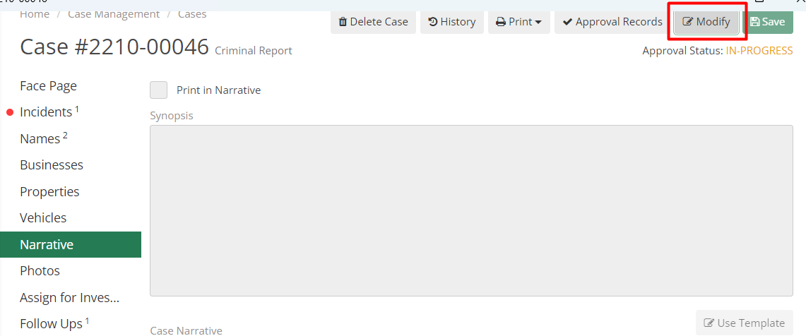 1. Go to the case that is not allowing narrative print outs. Click on the narrative tab.