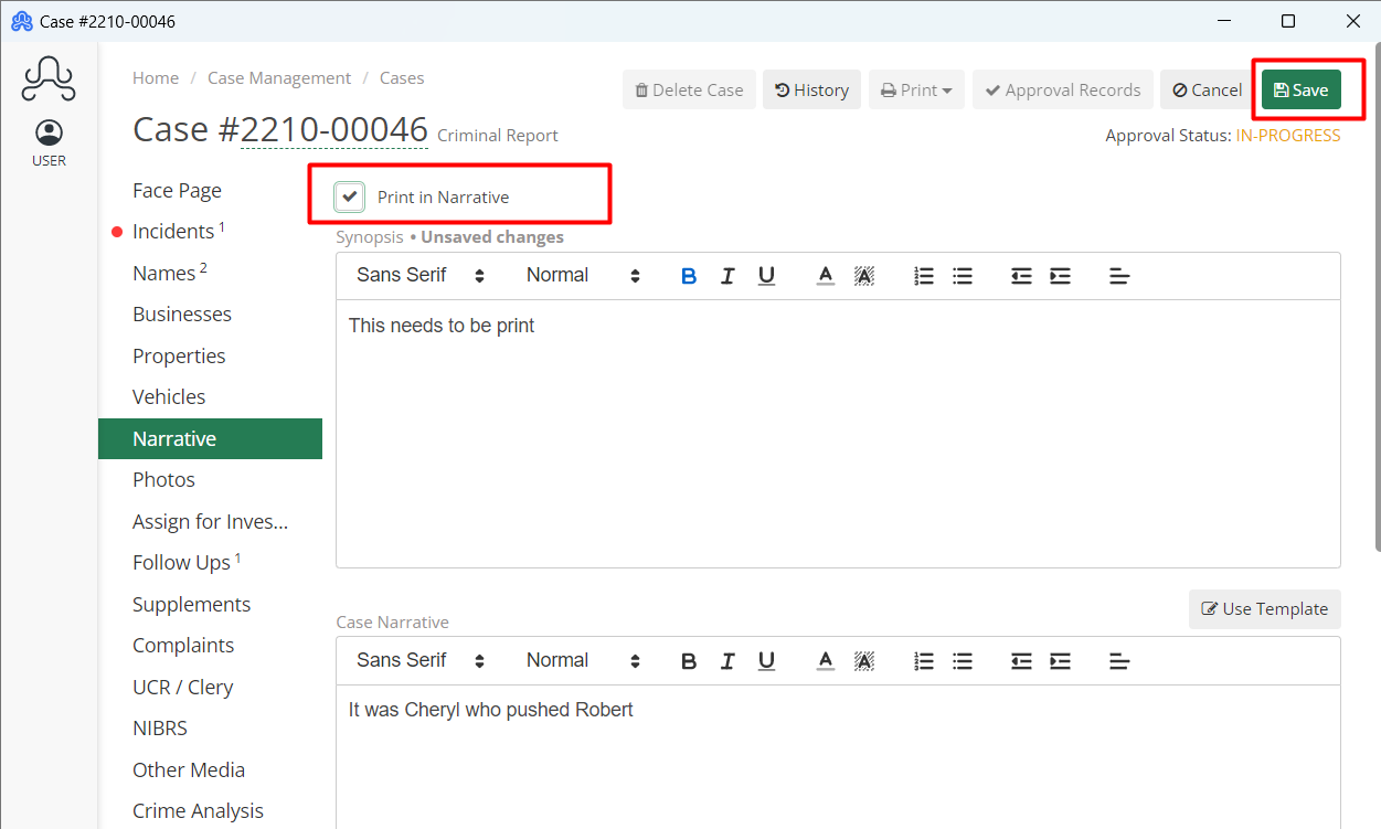 Test the print option on the case, to confirm that the narrative is now being printed.