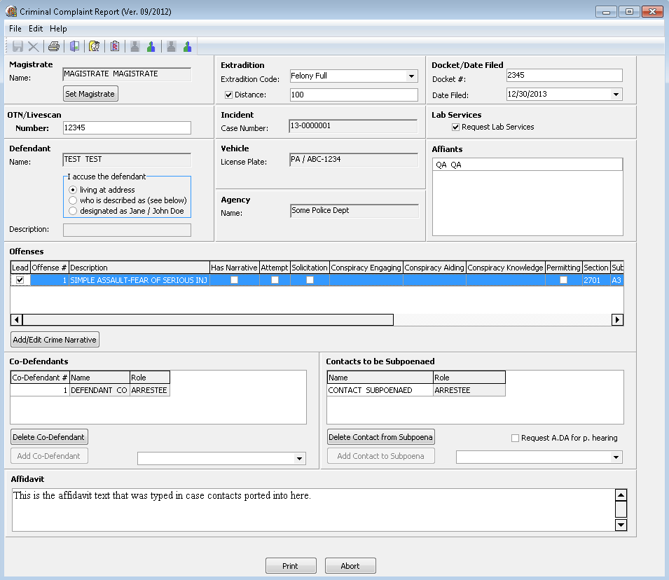 - Fields for “Docket Number” and “Date Filed” have been added to the form and display on the printed Criminal Complaint.