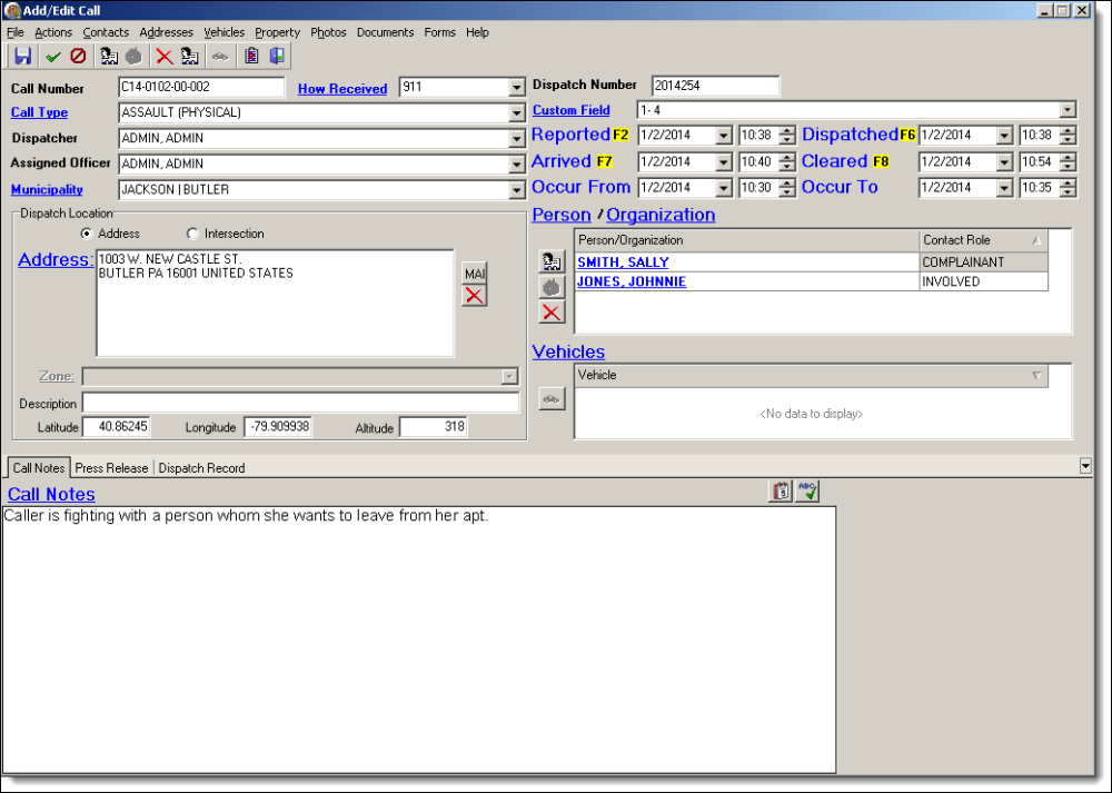 - The window for adding, and/or editing calls was redesigned as illustrated below. The new interface group’s related fields closer together to make data entry easier, thus reducing the total time needed to add or edit calls.