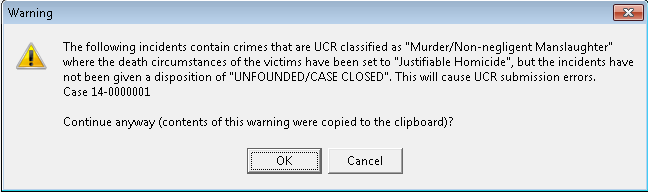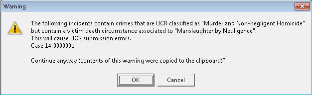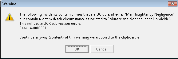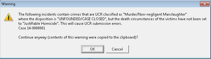 - Since this is a warning message, it does not hinder the monthly statistics. However, failure to correct the case in violation could lead to lower UCR statistics.