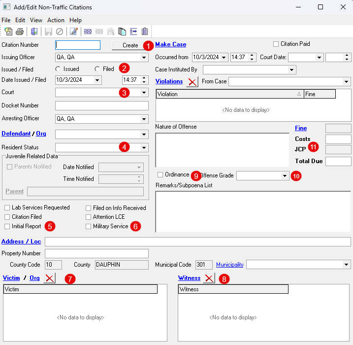 - Added fields to indicate whether the citation was “Issued” or “Filed.” (Users must select an option to save the citation.)