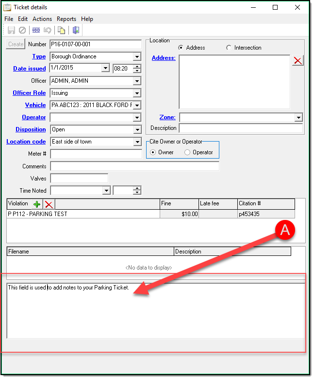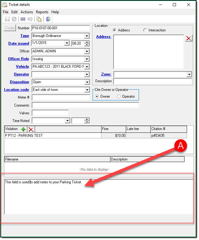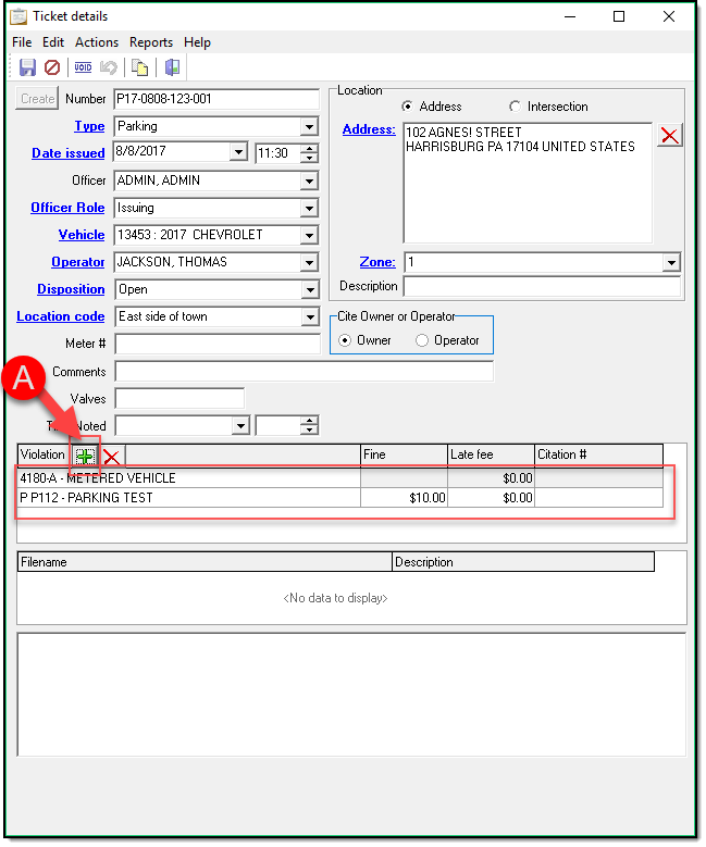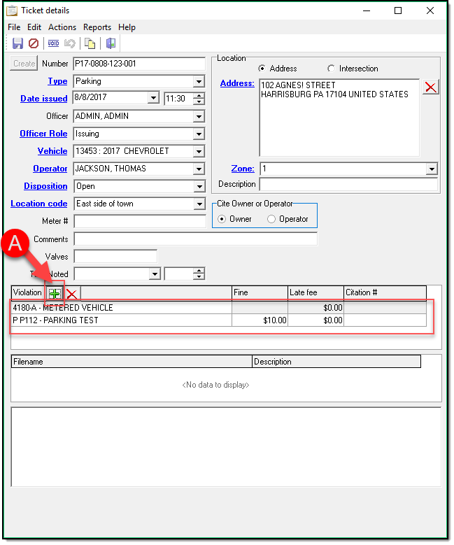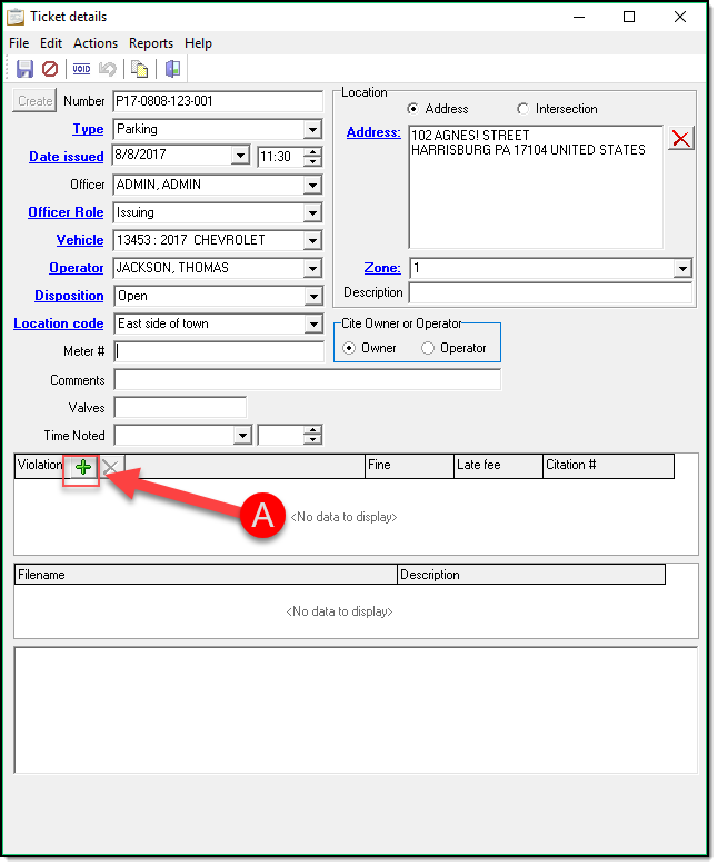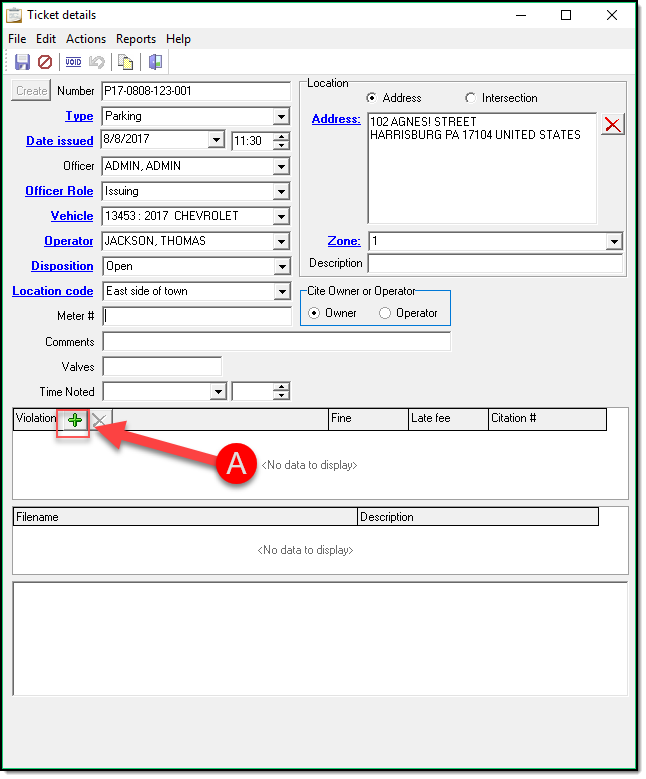 Note that you can add multiple Violations to one ticket by Clicking the Add (A) in the Violation field for each Violation needed.