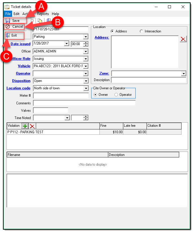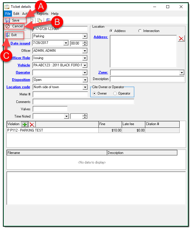 When you are finished adding or editing the ticket, you should Save (A) it. You can also Cancel (B) the ticket or Exit ( C ) the window.