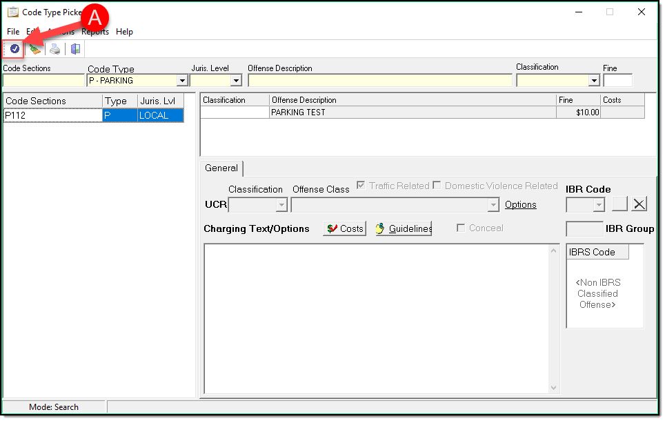 Browse the Codes Module for the violation you need highlight and hit Choose (A) (for this example I sorted by the Code Type of Parking)