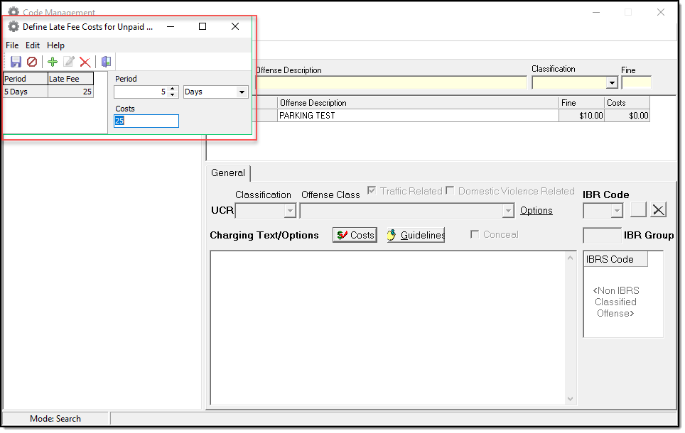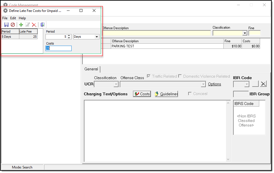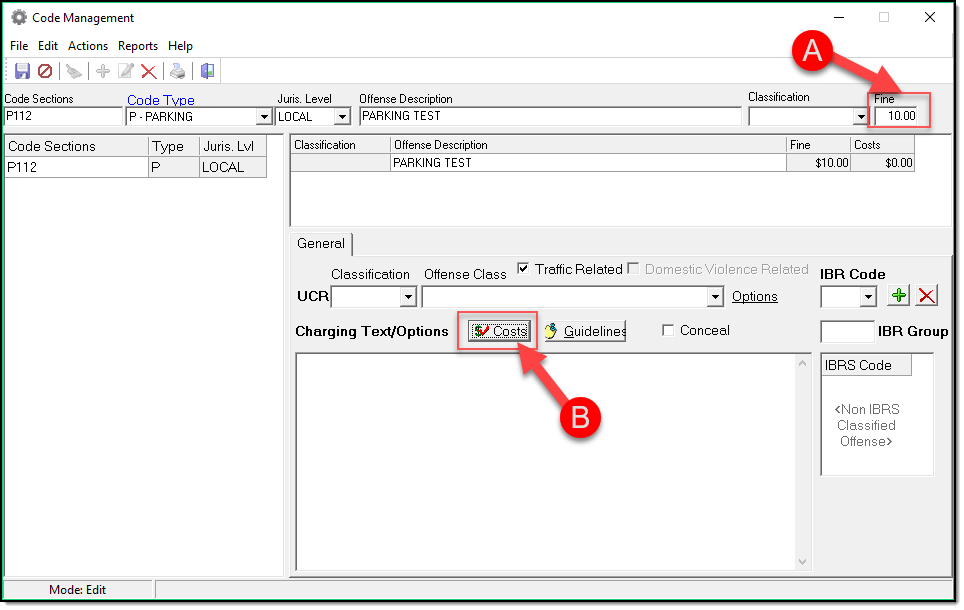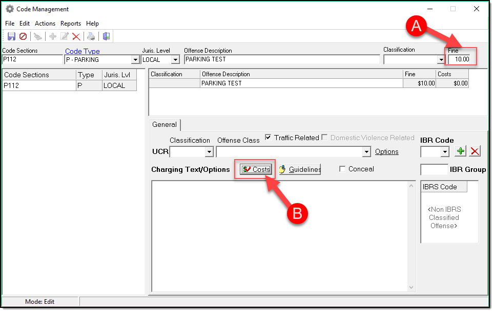 It is important to have the Fine and Costs associated with the Violations. This can be done by your administrator within the Code Management. They have the ability to edit the Codes that are typically used and add Fines (A) and Costs (B) for help with adding costs please refer to our Costs Section in the Code Management part of this manual.