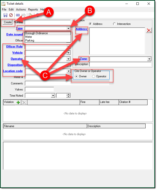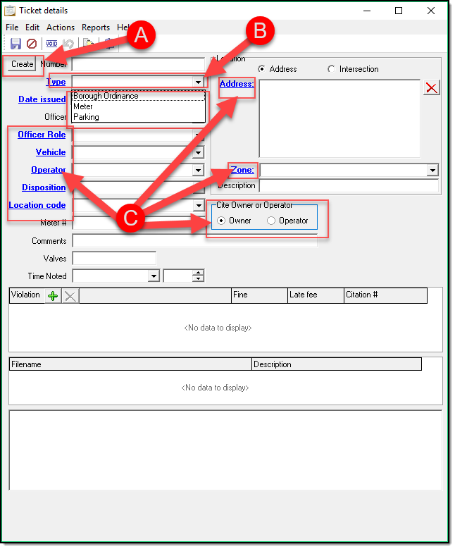 On the Ticket Details screen click Create (A) to create your Parking Ticket number, Type (B) and choose the type of ticket from the dropdown list, and enter your ticket details with the remaining dropdown lists and hyper links ( C ) similar to any other area of RMS when you need to add details.