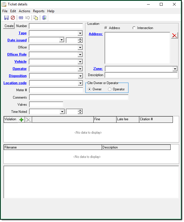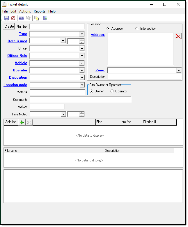 Adding or Editing parking tickets is very similar to traffic and non-traffic citations and warnings. The fields on the Ticket Details screen use a variety of standard control-types. Several of these pick-lists (Type, Officer Role, Disposition, Location code, Violations) should be customized by an administrator.