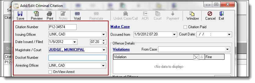 2. Enter any corresponding information in the following fields: Citation Number, Issuing Officer, Date/Time Issued, Magistrate/ Court, Docket Number and Arresting Officer.