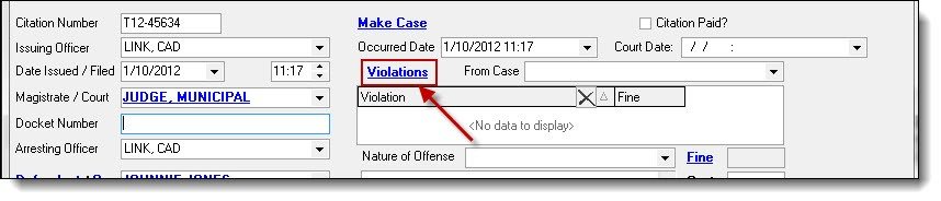 1. To add a violation to the citation, click the blue word “Violations”.