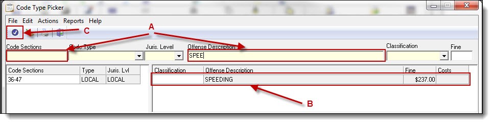 2. Enter part of the code section or offense description (A), select the crimes code (B), and then click the “Choose” button ( C ).