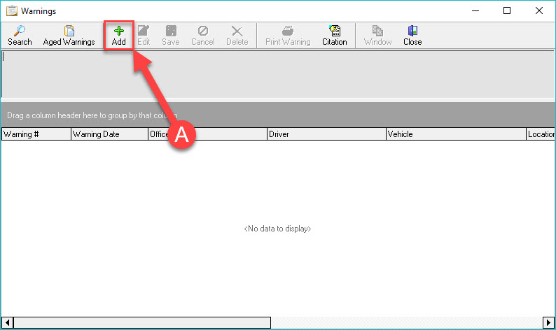 To add a Warning to the RMS system, with the Warning module open, press the ‘Add’ button (A).