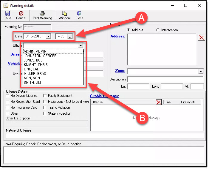 This will open the Warning details window where you can fill in the details of the Warning. Fill in the date/time, driver, vehicle, and if it requires a follow up (A). Then set the location of the warning (B). Next, enter the Offense Details, including the Crimes Codes you would have cited the driver for ( C ). Finally, add notes on what needs to be repaired, replaced, or Re-Inspected (D).