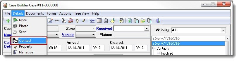 1. To add or view contacts associated with the case, select “Contact” from the Details drop down list.