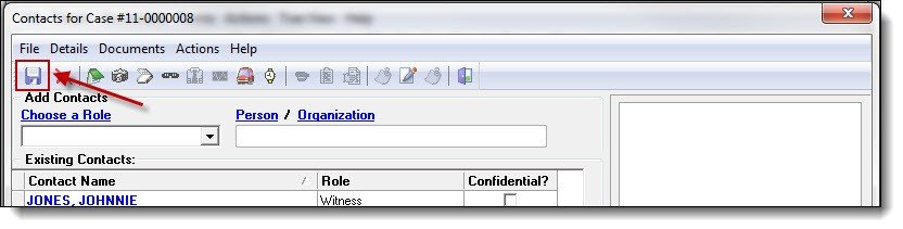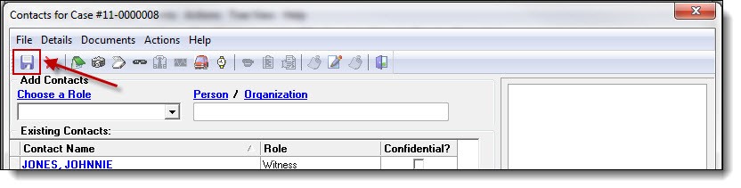 9. Once all of the contacts have been added to the case and associated with the correct crimes, click the “Save” button (if active), to save any outstanding changes.