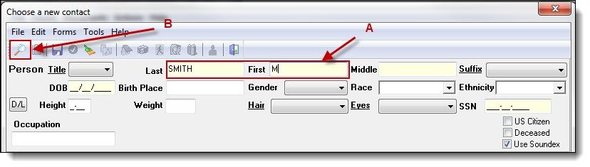 4. Enter part of the person’s last name, first name, or both (A), then click the “Search” button (B) to see if the person exists in the database.