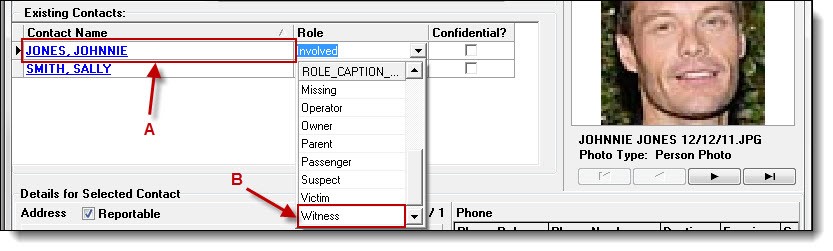 2. Contacts entered into the call will display in the Contacts window. The contacts will be listed with the role that was selected from the call details. To change a contact’s role, highlight the contact (A), and then click on the “Role” field to select a choice from the drop down list (B).