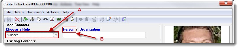 3. To add a new contact, select a contact role (A), and then click on the word “Person” (B).