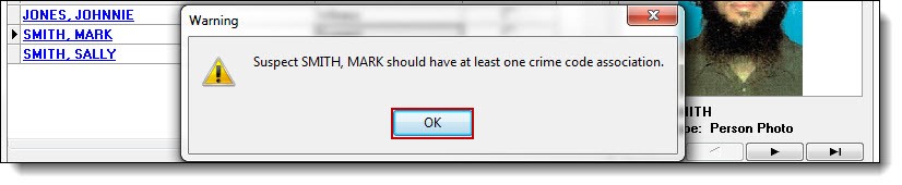 7. If you use the role of Victim, Suspect, or Arrestee, you will be prompted with a warning that the contact needs a crime code association. Click the “OK” button in the Warning box.