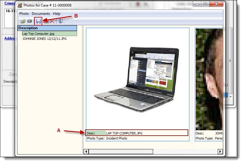 4. Enter a proper photo description (A), and then click the “Save” button (B), to save the photo(s) to the case.