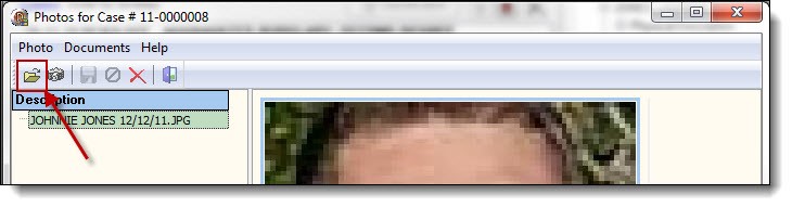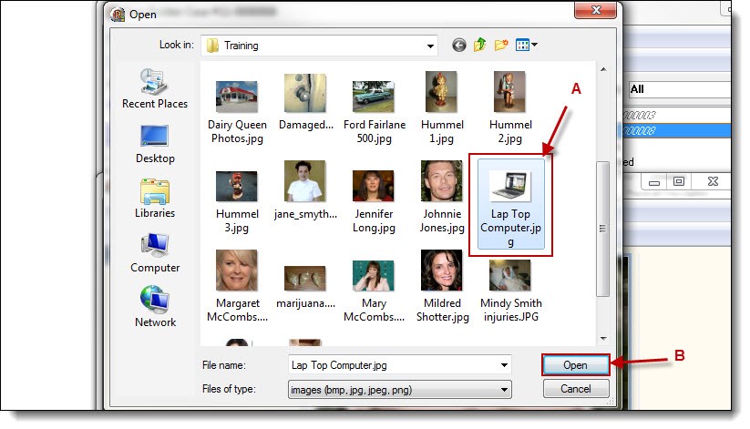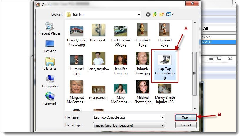 3. Browse to the photo’s storage location. Select the photo you wish to add to your case (A), and then click the “Open” button (B).