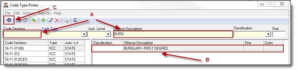 2. Enter part of the code section or offense description (A), select the crimes code (B), and then click the “Choose” button (C.).