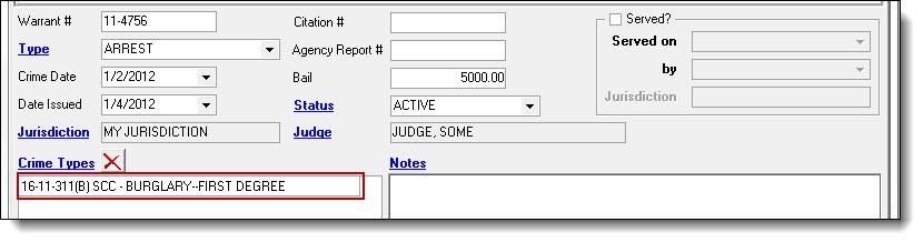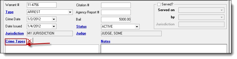 - Crime Types is not a required field to save a warrant; however, certain warrant reports are based on this field containing data. For accurate reporting, please enter the crime type.