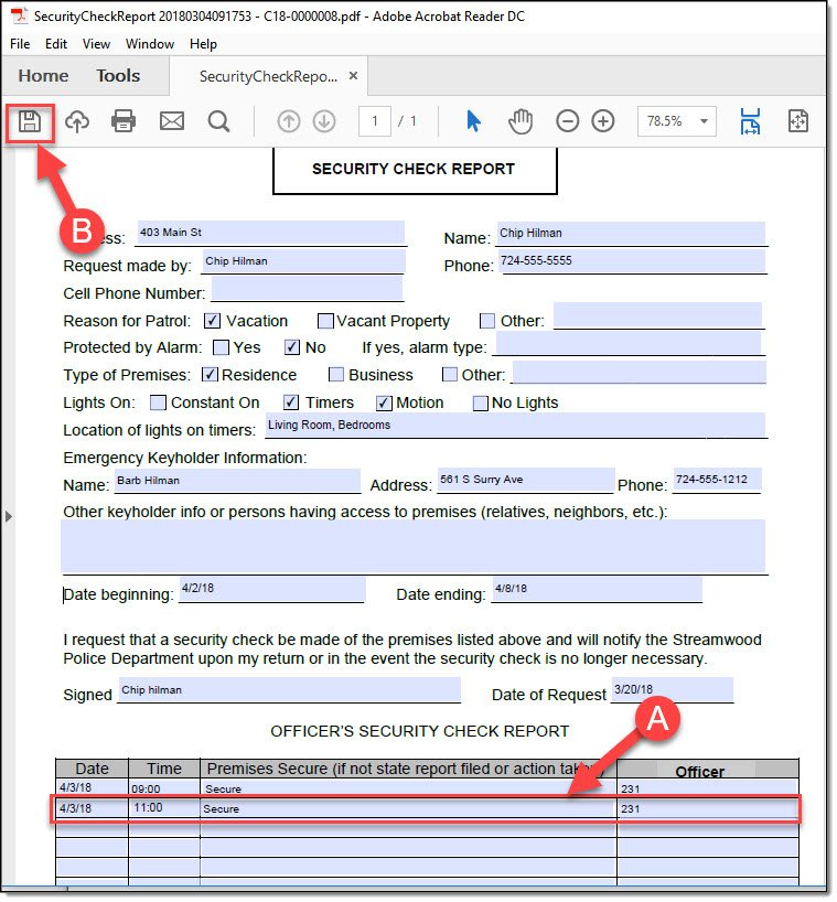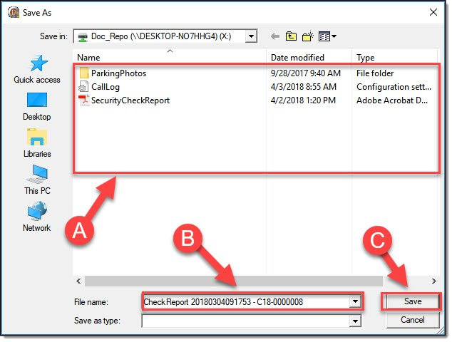 3. A Save File dialog window will open to your agency’s Document Repository location. Choose or create a location/sublocation (per your agency’s standards) inside the Document Repository (A). Enter a File name (B). By default, the File name is the Form name + date/time (yyyyddmmhhmmss). The best practice is to include the call number as part of the file name. Select the “Save” button (C ).