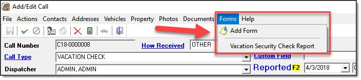 1. In the Add/Edit Call window, select the Forms drop down list. This list will display any available forms that can be linked to the call-for-service.