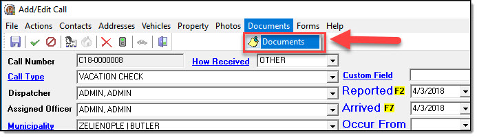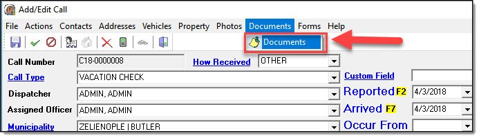 Once a form has been saved and linked to a call-for-service, it can be found in the Documents section of the Add/Edit Call window.