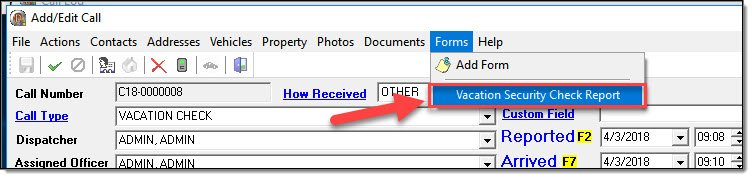 Agency-specific forms can be attached to calls-for-service using the Forms drop down list on the Add/Edit Call window. These forms can be templates made in Word, Excel, Adobe PDF, as well as various other programs. More information regarding the setup of these forms can be found in the “Call Log Forms” topic under the Supervisory Functions section of this chapter.