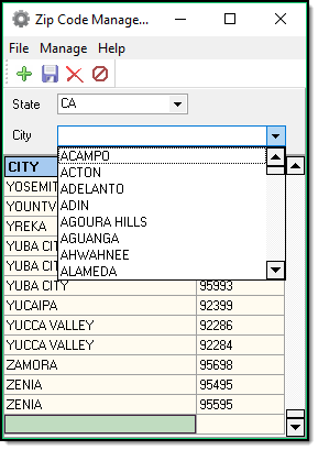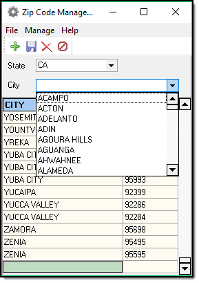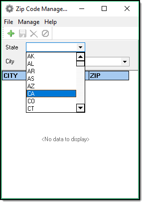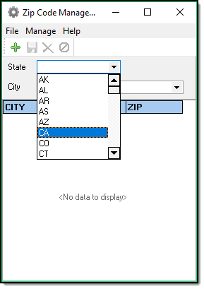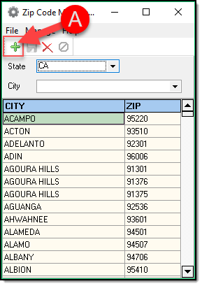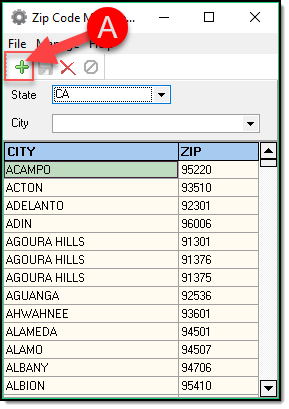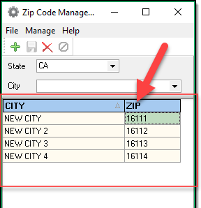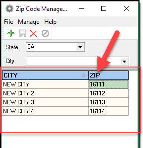 1. From the main Zipcode Management window, select the State in which you wish to add a zip code.